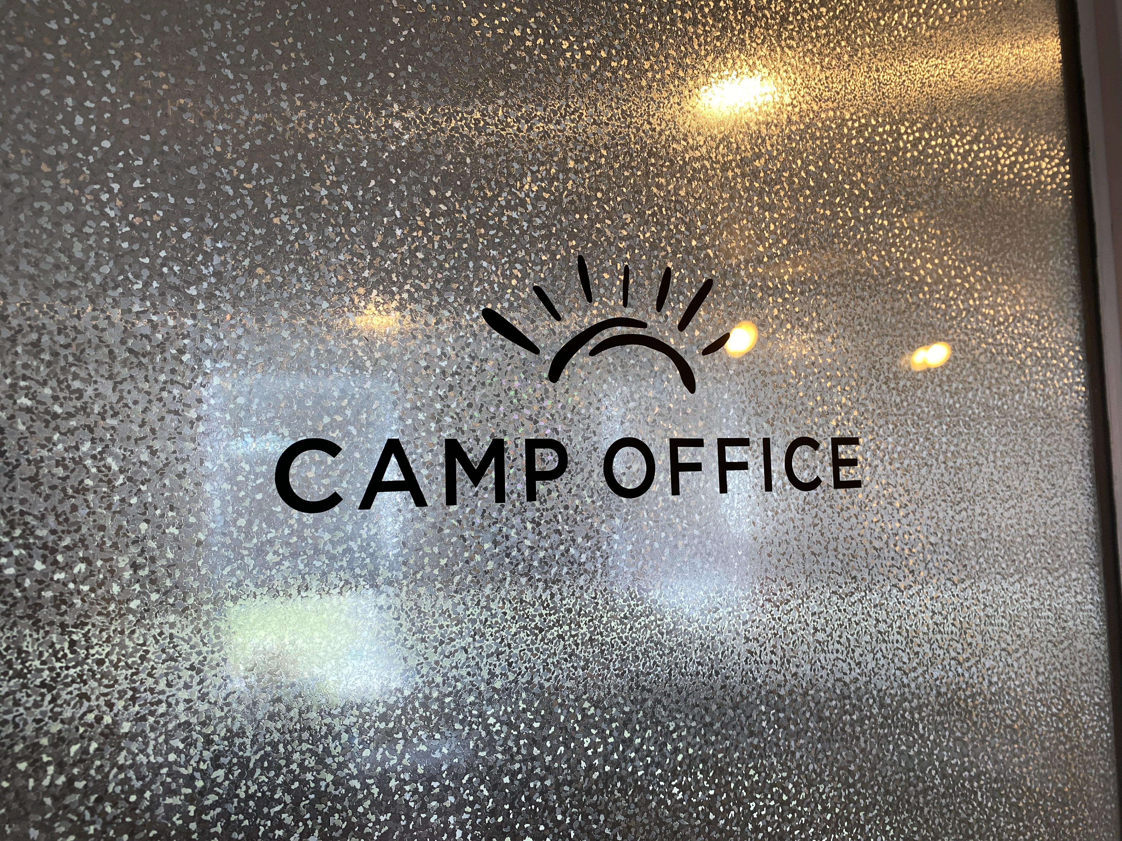 Multi-colored vinyl lettering on a glass doorway