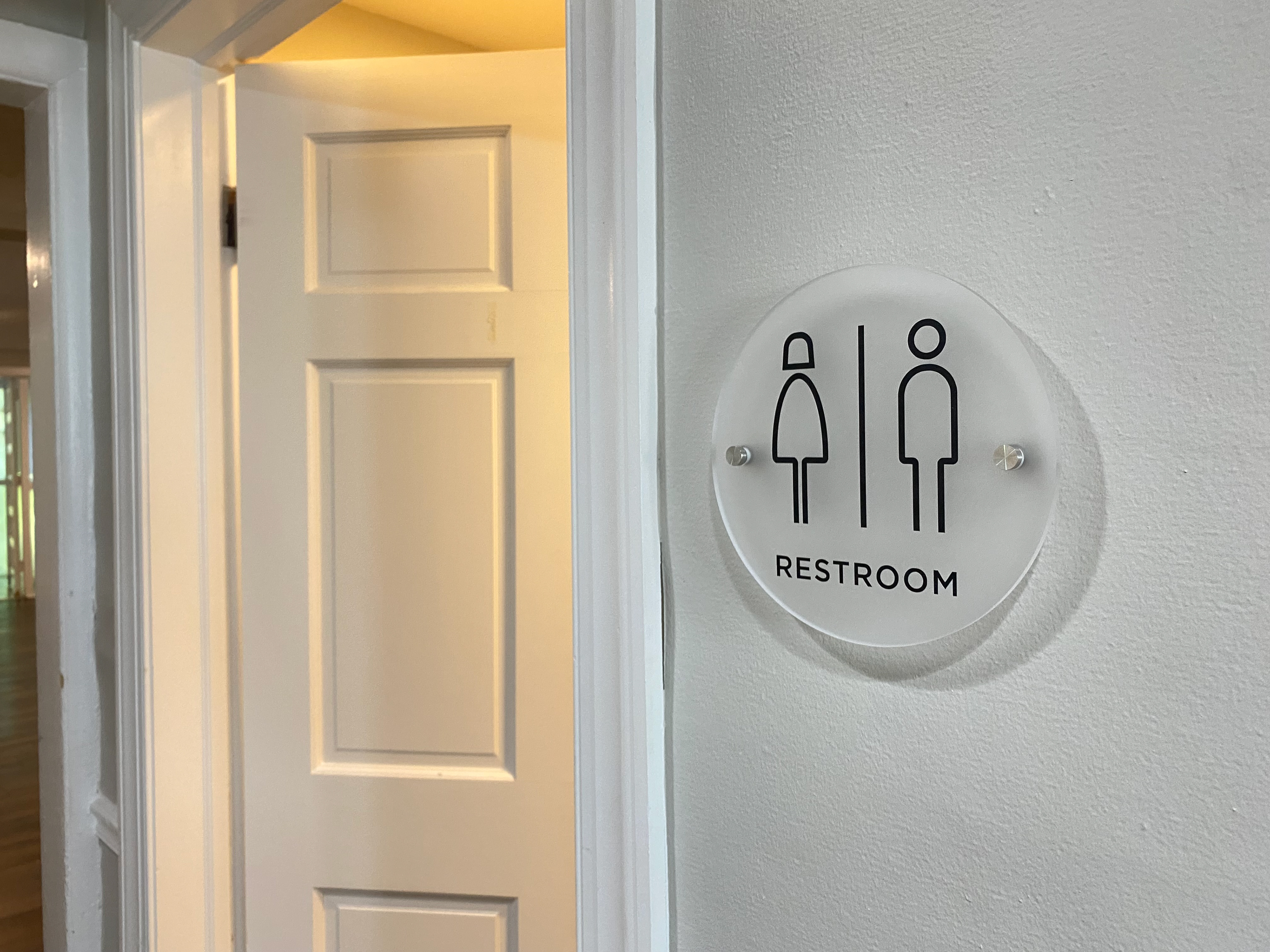 Restroom Signage. Vinyl lettering on clear frosted acrylic mounted with standoffs.